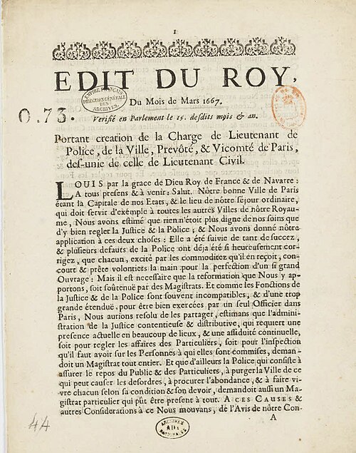 Fue bajo Luis XIV, en 1667, cuando se creó en París el cargo de lieutenant général de police, el Teniente general de policía, considerado el origen de la policía moderna. Este cargo posteriormente se convertiría en un Ministerio durante la Revolución y el período Napoleónico. Era un cargo con poder normativo que permitía crear normas con sanciones tan severas que a estos efectos se podrían considerar normas penales. Era un cargo también con poder judicial en todas aquellas materias que se consideraban no tenían que llegar a los tribunales. La policía era el cargo y sus poderes, no el cuerpo de agentes. Este edicto no creó un cuerpo de personas encargados de garantizar el cumplimiento de la ley, aunque eventualmente el sistema de policía de París evolucionó para contar con una fuerza armada de hombres (algunos con formación militar). Los hombres al servicio del Teniente contaban con 3 inspectores que practicaban detenciones informados por una amplia red de informantes policiales y “soplones”. Este cargo tenía la función de vigilar, controlar y disciplinar a la población urbana, un espacio en el que el crecimiento demográfico, la pobreza y el comercio empezaban a generar tensiones sociales. El control de la opinión pública era igualmente importante, así como la represión de la disidencia religiosa o política. El control de la opinión se contemplaba como una forma de “mantener el orden” dada la creencia de que las “ideas peligrosas” eran la fuente de problemas. ¿Quién era el “objeto” de la acción policial en Paris? Fundamentalmente los pobres sin trabajo. Este proletariado era el objetivo obvio por varias razones: se le consideraba responsable de los delitos y podían ser movilizados para generar disturbios. La idea es que había que proteger a la clase trabajadora de ser contaminada por este proletariado.