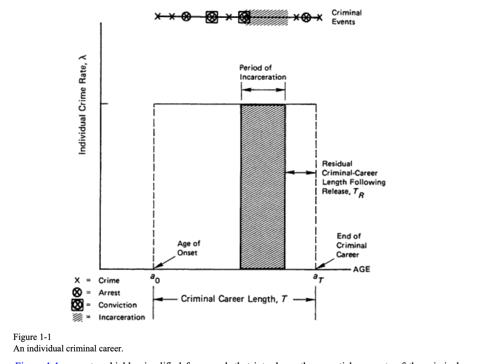 Las carreras criminales tienen un inicio (en inglés “onset”) y un momento en el que finalizan. Durante este período en el que se encuentran activos los delincuentes cometen un número de delitos X, una minoría de los cuales son detectados y sancionados por el sistema penal (dando lugar a periodos en los que los delincuentes, si encuentran en prisión, se encuentran incapacitados para cometer delitos que requieran su presencia física fuera de la prisión).