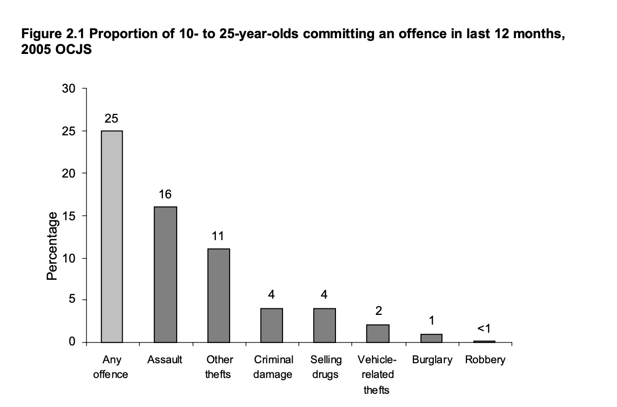 Según este estudio un cuarto de la población de Inglaterra y Gáles con una edad comprendida entre los 10 y 25 años había cometido un delito en los previos 12 meses. La mitad de estas infracciones eran según los autores “delitos serios” (lesiones, robos de vehículos, robos en viviendas, venta de drogas de clase A o robos con violencia) (Wilson, Sharp, y Patterson 2006). Este tipo de datos seriamente cuestiona la idea de que podemos distinguir claramente entre delincuentes y no delincuentes.