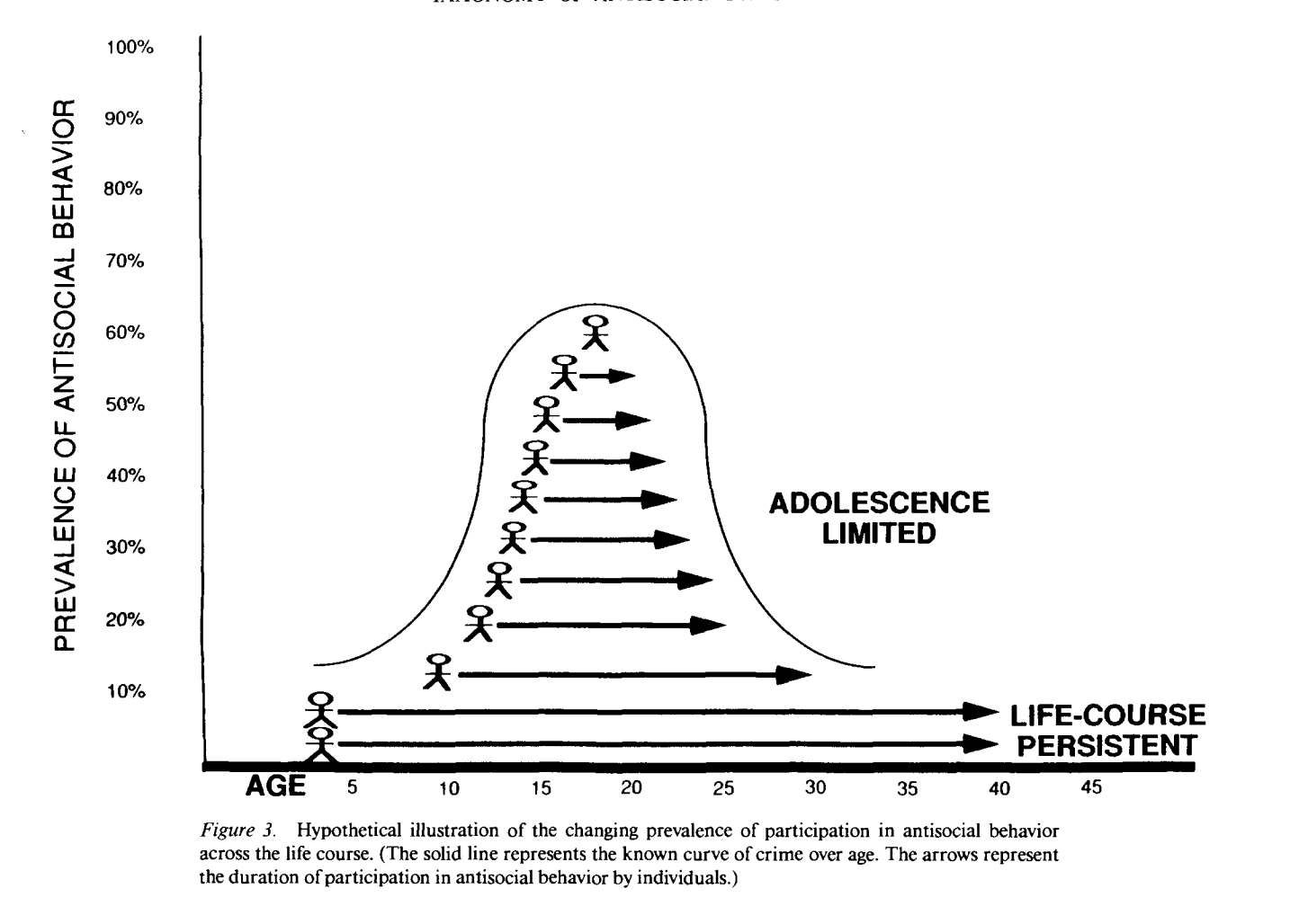 Años más tarde la también normeamericana Terrie Moffitt publicó un muy influyente artículo que trataba de reconciliar los datos que estudios longitudinales posteriores habían ido generando sobre trayectorias delictivas. En un muy influyente artículo publicado en 1993 y titulado Adolescence-Limited and Life-Course-Persistent Antisocial Behavior: A Developmental Taxonomy la profesora Moffitt proponía la existencia de dos tipos ideales de trayectorias delictivas, la trayectoria limitada a la adolescencia y la trayectoria antisocial persistente a lo largo de la vida.