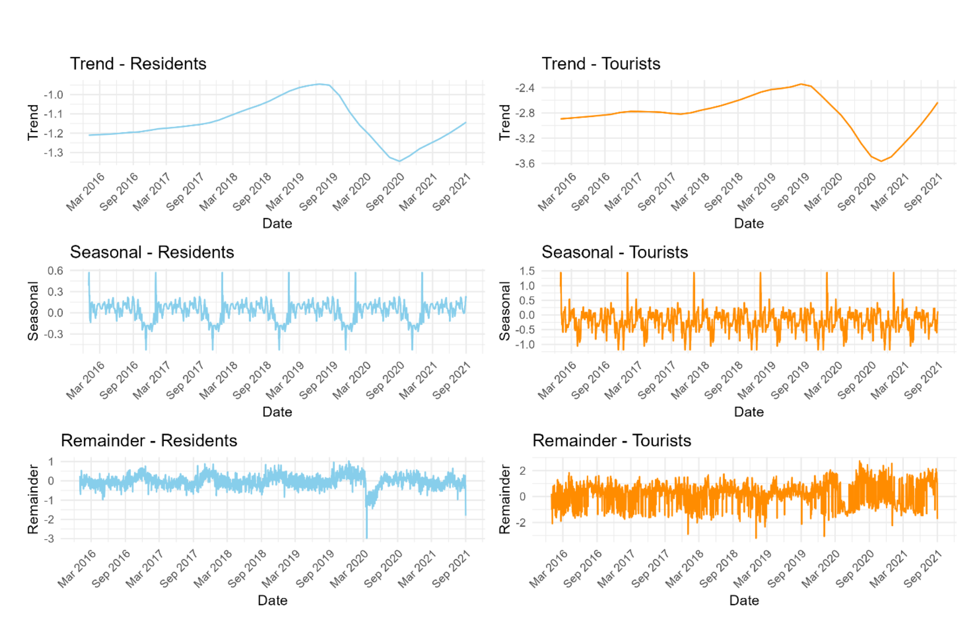 Los delitos suelen aumentar los fines de semana y durante la noche, especialmente para las lesiones y ciertos robos en zonas nocturnas de ocio y entretenimiento, para luego descender dramáticamente durante la madrugada. En los puntos de conexión de los sistemas de transporte público, los delitos son mas comunes durante las noches, y en los períodos vacacionales, con factores ambientales (por ejemplo, la presencia de establecimientos de venta de alcohol) influenciando estos patrones.