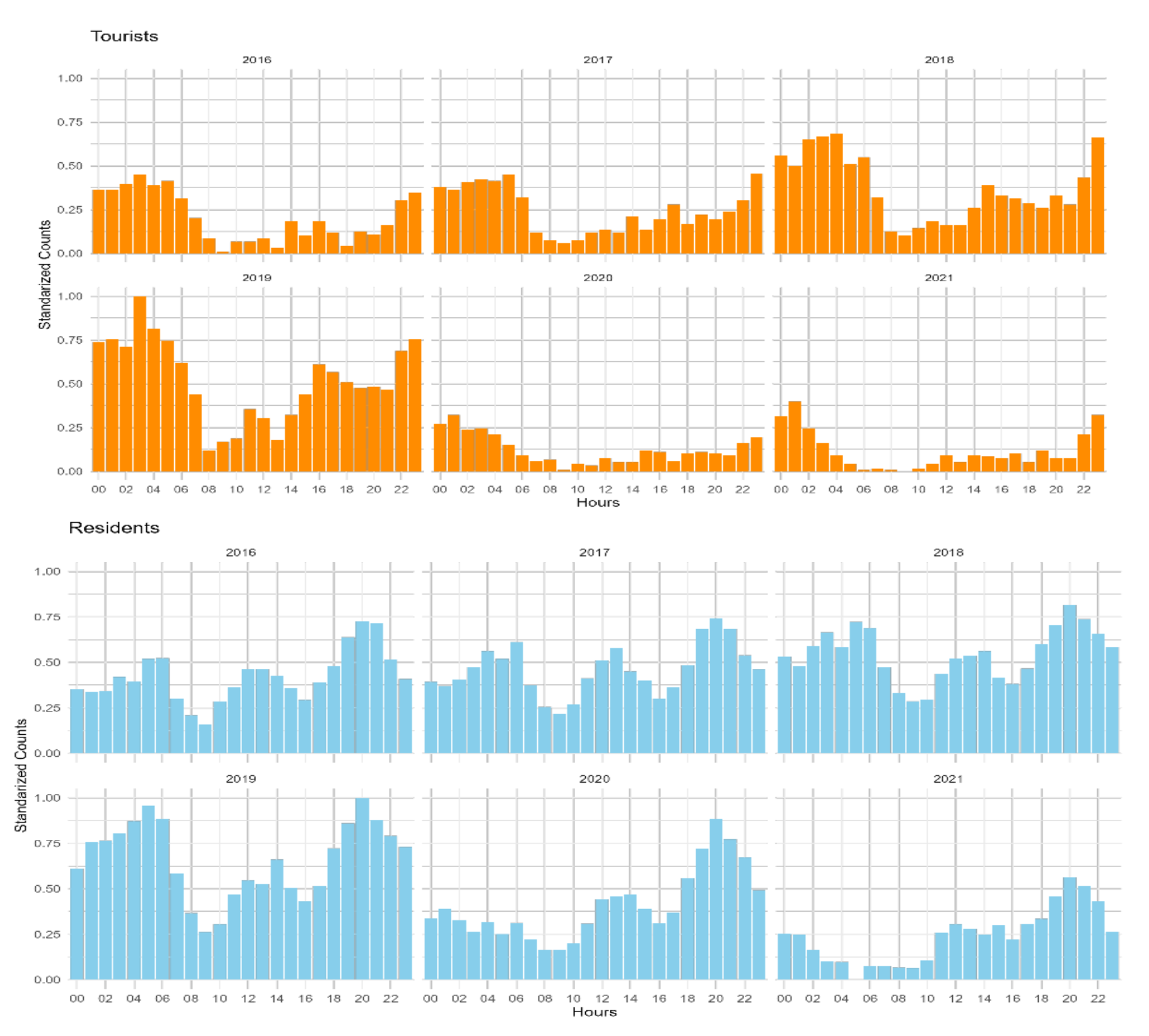 Los delitos se encuentran altamente concentrados en momentos específicos del día y de la semana, pero la intensidad de estas concentraciones varía por tipo de delito y región. Por ejemplo, algunos estudios sugieren que los robos a usarios de bancos o servicios de entrega de comida a domicilio suelen concentrarse en horas muy concretas, mientras que los hurtos y otro tipo de robos exhiben una menor concentración (Prieto-Curiel 2021). Estos “puntos calientes” temporales son estables en el tiempo y pueden ser visualizados como “latidos” (heartbeats) del delito, mostrando periodos de alto y bajo riesgo.